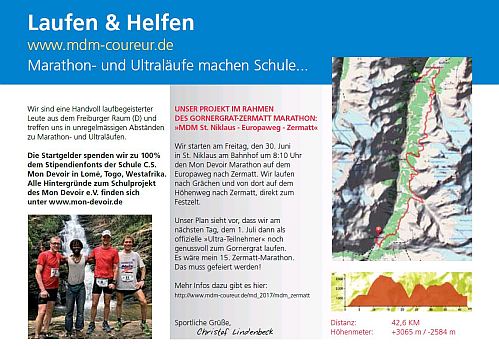 Das Renngeschehen der MDMler individualisiert sich; Gerd gibt Gas, Mario und Torsten bleiben zusammen, Jürgen dreht bis Zermatt richtig auf und macht dann gemütlicher weiter. Für mich gibt es außergewöhnlich viele Gespräche unterwegs, was auch mit meiner MDM-Overseas Advertising-Strategie im Zusammenhang steht. Ich freue mich sehr darüber, dass Andrea und Didi die 2.500 Africa Marathon Challenge Flyer in die Startbeutel verteilt haben. Danke für Eure Unterstützung.
