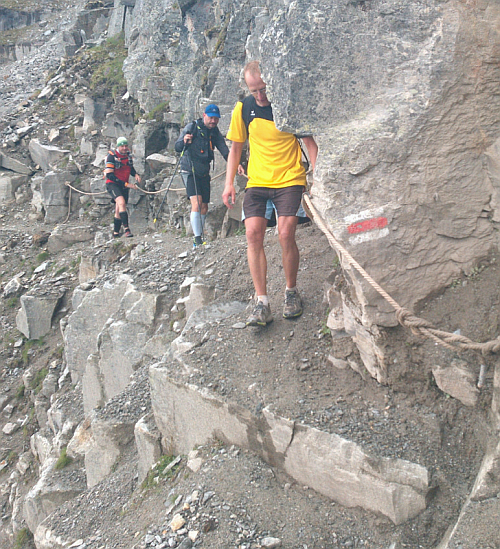 Dann war da noch der nette Empfang auf der Europahütte. Ein Garant für gehaltvolle Suppen und große Bierhumpen. Jürgen hat die Spendierhosen an und lädt uns alle trotz Hüttenpreisen ein. Danke. Auf dem zweiten Teil wird es dann etwas zäh. Jürgen und ich bilden die Nachhut und sichern die anderen nach hinten ab. Aber das nächste Highlight und unsere Schnellen warten schon auf uns: Täschalp, eine Einkehr an der man nicht vorbeilaufen sollte wenn man gerne netten Menschen bei der Arbeit zusieht. Thematisch geraten wir wieder auf Abwege. Bin ich mit Gerd unterwegs ist der nächste Lachflash nie weit. Wir helfen dann noch beim Abräumen und geraten so in die urgemütliche Küche mit dem Bollerofen auf dem die Täschalp-Équipe gerade feinste Pasta zubereitet. Doch wir müssen weiter, Steinschlaggebiete und brüchiger Bündner Schiefer wollen durchquert werden. Auf den Höhen vor Zermatt löst sich die Spitzengruppe um Mario, Gerd und Torsten endgültig vom Hauptfeld. Die geplante Schleife am Ziel vorbei wird in unterschiedlichen Versionen gemeistert: Mario wollte partout die Gornerschlucht nicht auslassen, die leider um diese Uhrzeit bei Kameraüberwachung 100 CHF Eintritt kostet. Auch Jürgen und ich verhaspeln uns in der unsäglichen Schleife um Zermatt und erreichen das Ziel nach einem ausgedehnten Spaziergang über Zermatts Flaniermeile, wobei wir - im Gegensatz zur Mehrzahl der Gäste - auch ohne gefüllte Einkaufstaschen durchkommen.